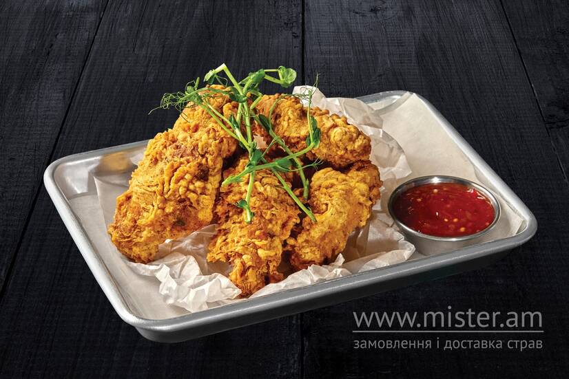 Курячі крильця,хрусткий пшеничний кляр, соус світ чилі.