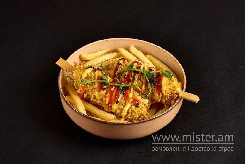 Молочна сосиска, кляр в панко, соус чедерта кисло-солодкий, картопля фрі.