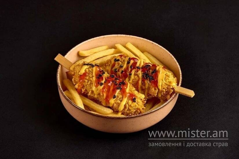Сир моцарела та молочна сосиска в клярі, кукурудзяні пластівці, соус чеддер та кисло-солодкий, картопля фрі.