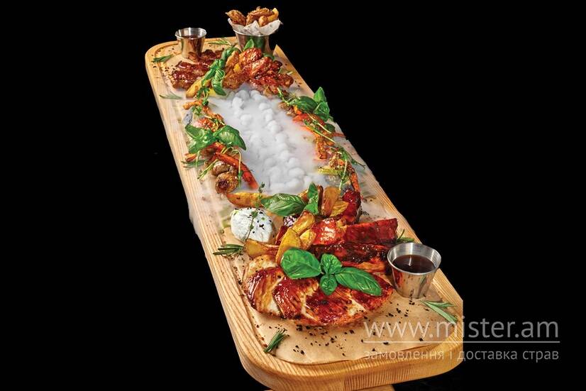Куряча грудка, свинячі ребра, курячі крила, стейк з ошийка, овочі гриль, картопля по-селянськи, мус дор блю, соус світ чилі та соус барбекю.