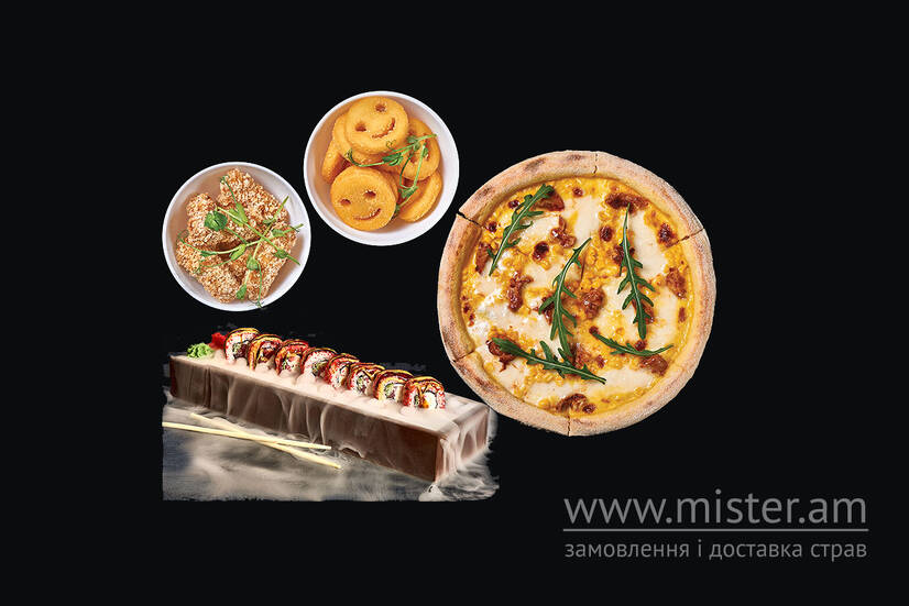 Рол Каліфорнія з тунцем, піца "Чікен корн чеддер", картопляні смайли, курячі нагетси.