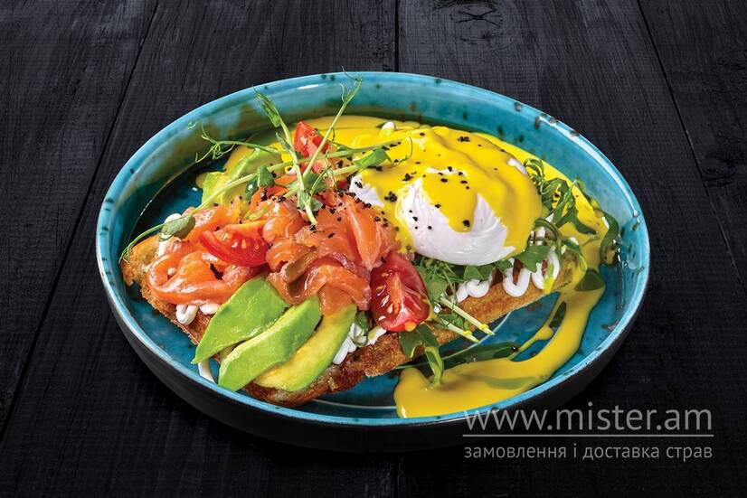 Картопляна вафля, слабосолений лосось, авокадо, яйце пашот, Філадельфія, помідор чері, соус чедер.