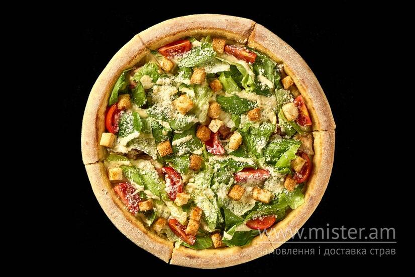 Вершковий соус з анчоусами, сир моцарела, куряче філе, бекон, помідор чері, пармезан, крутони.
