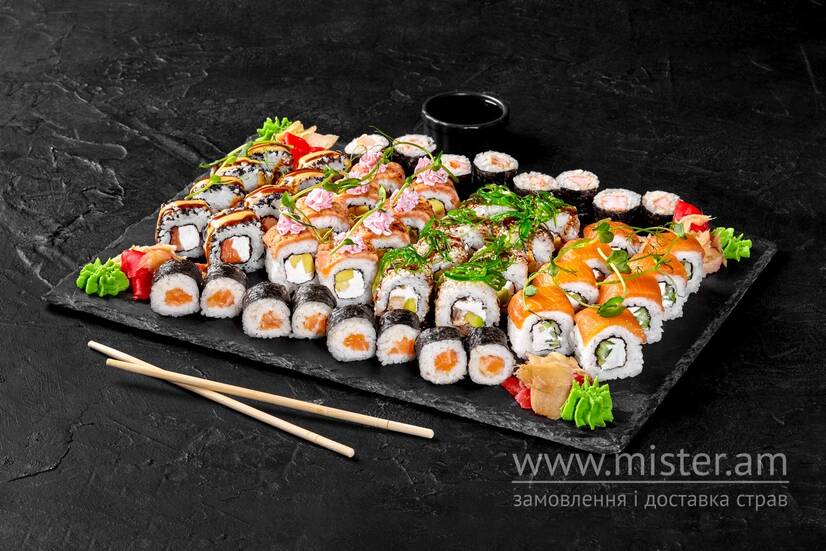 Каліфорнія з тунцем, Філадельфія з лососем та огірком, Каліфорнія з лососем, Каліфорнія з кунжутом.