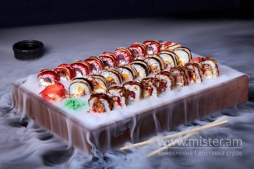 Кранч-рол з тунцем та запеченим лососем, кранч-рол з манго та запеченим лососем, Каліфорнія з тунцем в масаго.