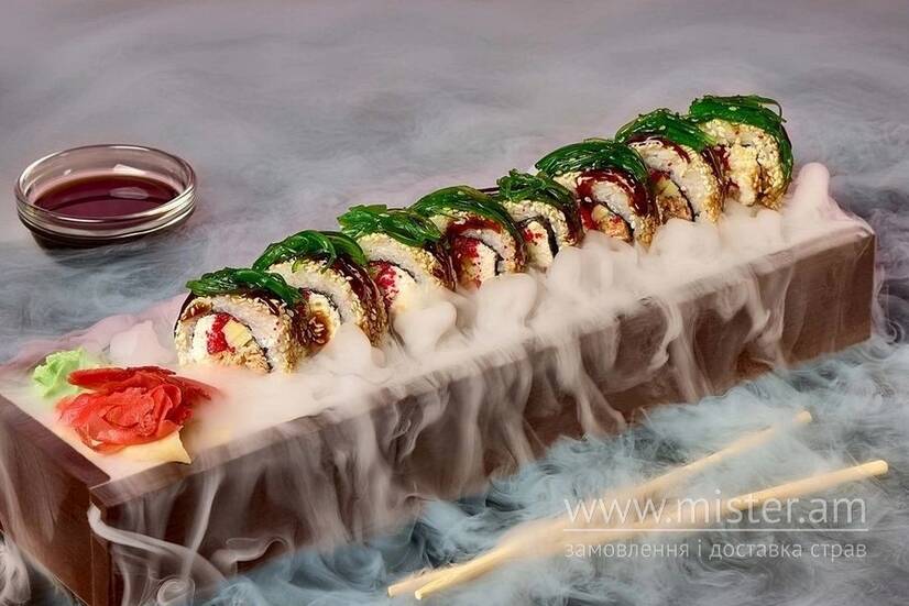 Авокадо, запечений лосось, Філадельфія, ікра масаго, соус унагі, чука.