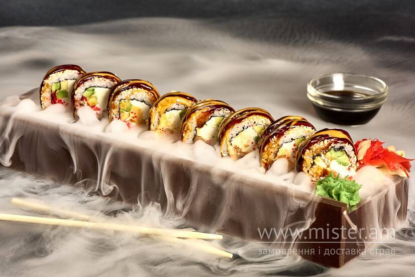 Креветка тигрова сувід, Філадельфія, авокадо, ікра масаго, кунжут, соус спайсі юдзу, соус унагі.