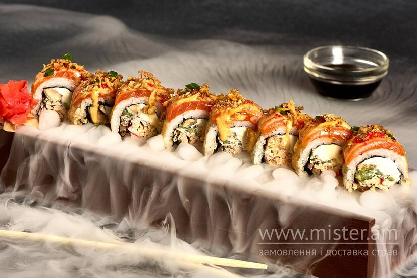 Лосось, Філадельфія, краб, гриби шиїтаке, вугор, огірок, ікра масаго, норі, соус спайсі юдзу, соус кімчі, світчилі, цибуля кріспі, цибуля зелена.