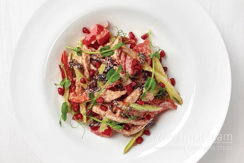 Філе куряче сувід, огірок, солодкий перець, помідор, чорнослив, цибуля, горіхова заправка з часником та духмяною олією.