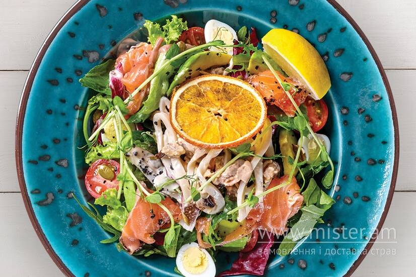 Мікс салатів, яйце, авокадо, помідор чері, кальмар, мідії, лосось с/с, легка заправка.