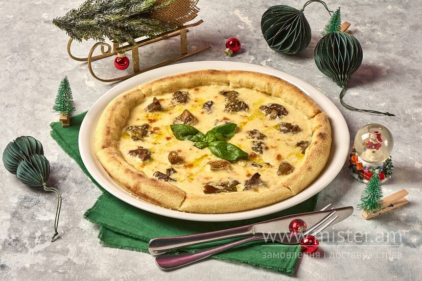 Гриби білі та маслюки, моцарела, пармезан, вершково-грибний соус, трюфельна олія.