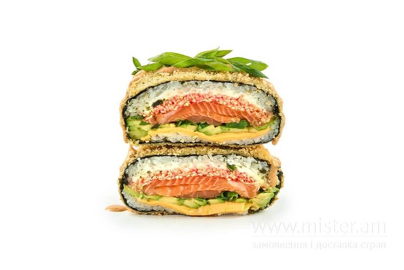 Філадельфія, японський майонез, гауда, лосось, ікра, цибуля зелена, авокадо, чеддер, соус тамарі.