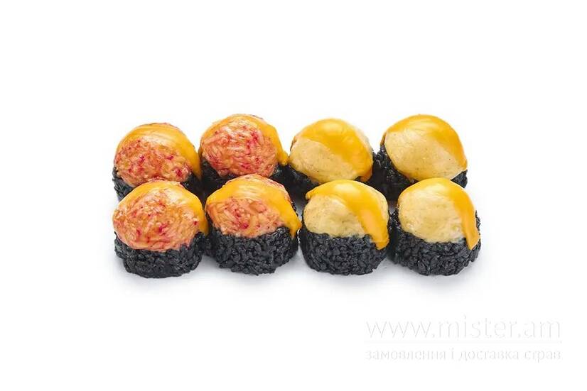 Філадельфія, іспанський хамон, креветка, чеддер, чорнило каракатиці, сирна шапочка наполовину гостра.