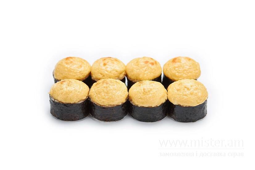 Рис, норі, сир Філадельфія, японський омлет, м`ясо сніжного краба, ікра летючої риби, сирна шапочка.