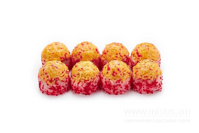 Рис, норі, сир Філадельфія, авокадо, креветка, ікра летючої риби, гостра сирна шапочка.