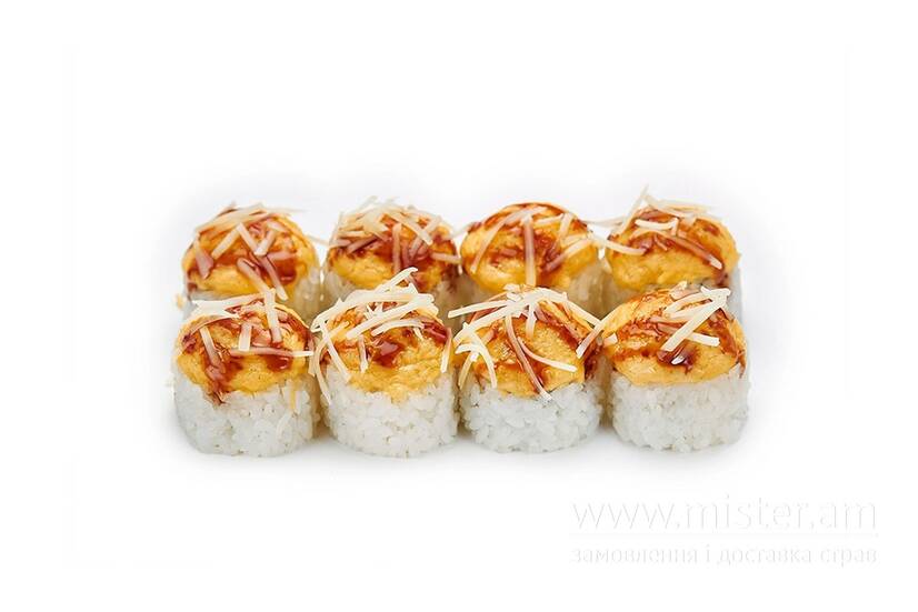 Норі, рис, сир Філадельфія, креветка, сирна шапочка, соус унагі, сир пармезан.