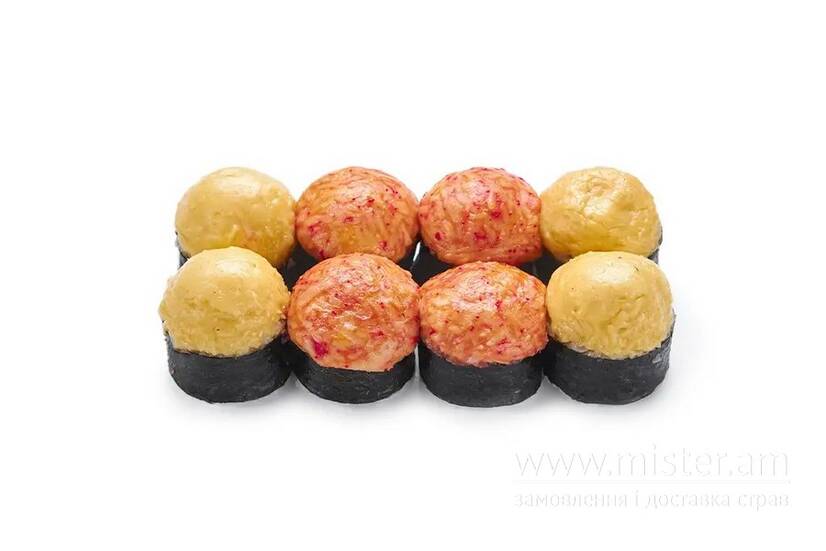 Філадельфія, лосось, японський омлет, сніжний краб, сирна шапочка наполовину гостра.