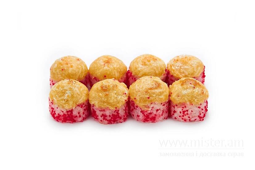Рис, норі, сир Філадельфія, авокадо, лосось, сирна шапочка з пармезаном.