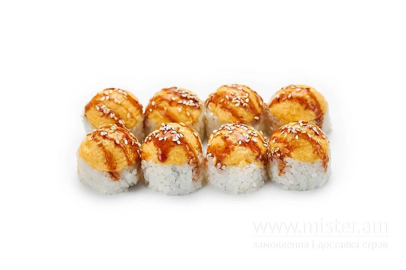 Норі, рис, сир Філадельфія, огірок, вугор, сирна шапочка, соус унагі, кунжут.