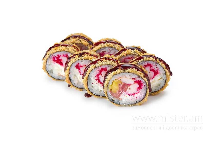 Філадельфія, ікра, креветки, хамон, манго, кляр, сухарі.