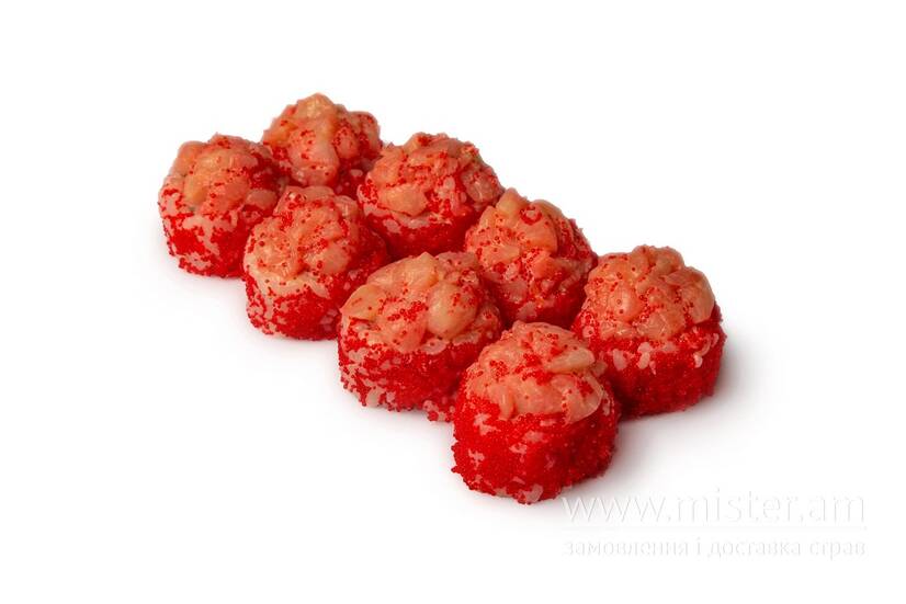 Рис, норі, сир вершковий, ікра летючої риби, авокадо, огірок, гребінець, японський майонез.