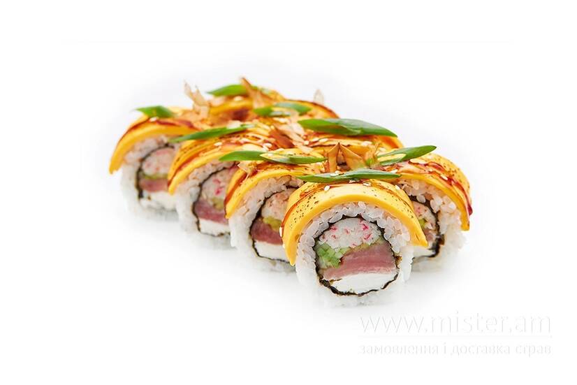 Норі, рис, сир Філадельфія, тунець, огірок, м`ясо сніжного краба, сир чеддер, соус унагі, соус peri, стружка тунця, цибуля зелена, кунжут.
