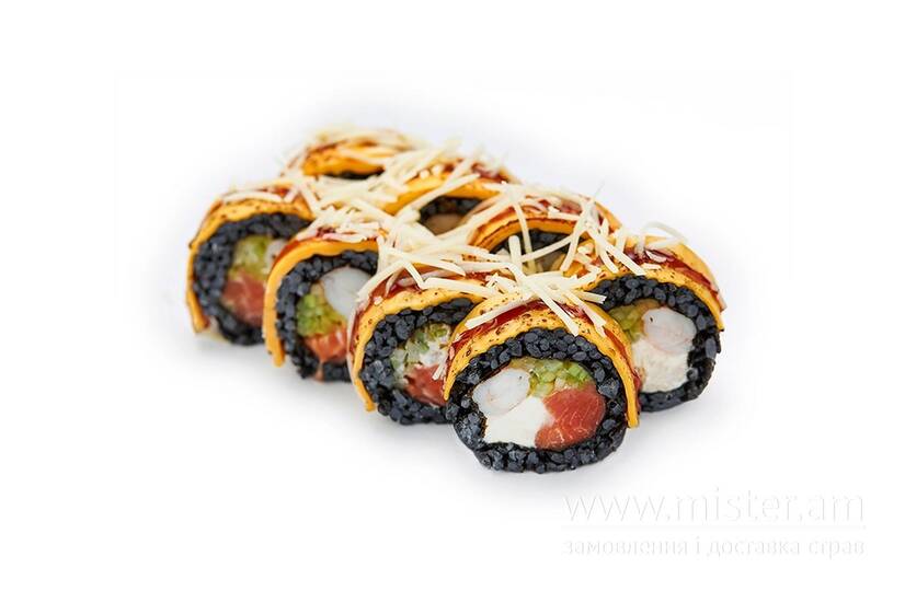 Рис, норі, чорнило каракатиці, сир Філадельфія, лосось, креветки, огірок, сир Чеддер, унагі, сир Пармезан.
