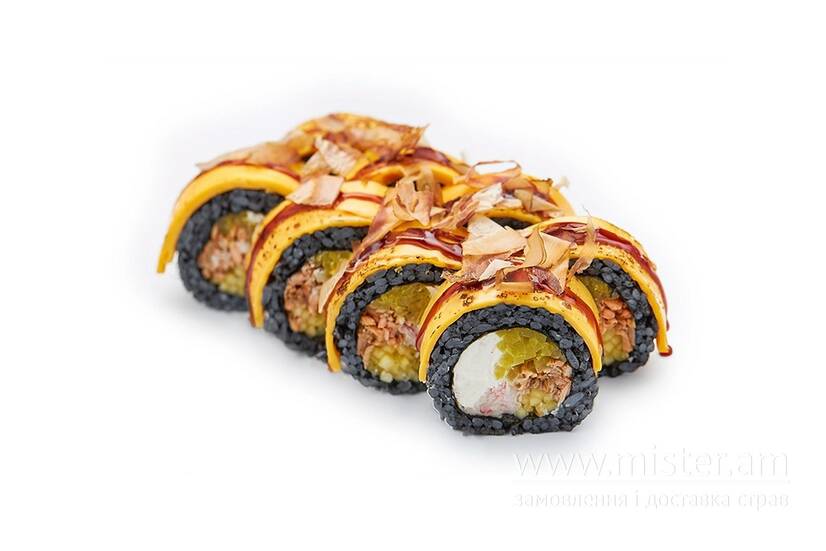 Норі, рис, чорнило каракатиці, сир Філадельфія, такуан, лосось теріякі, манго, м`ясо сніжного краба, сир чеддер, соус унагі, стружка тунця.