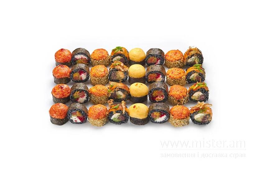 Рол теплий Міх з гострою шапочкою, рол Сакура, рол Катоні з тунцем (пікантно гострий), запечений з лососем та крабом Міх.