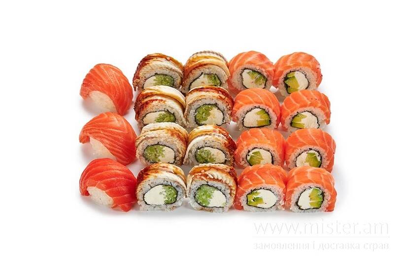 Філадельфія з лососем і авокадо, Філадельфія з вугрем, нігірі з лососем 3 шт.