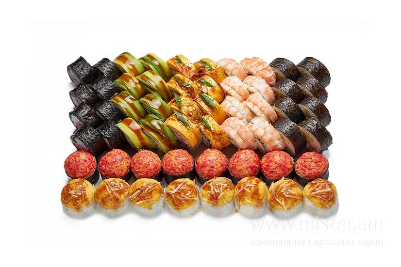 Філадельфія з креветкою і огірком, Запечений з крабом гострий, Запечений з креветкою манго та пармезаном, рол Май Шу, рол Кайло Рен, рол Ситх, рол Набу.