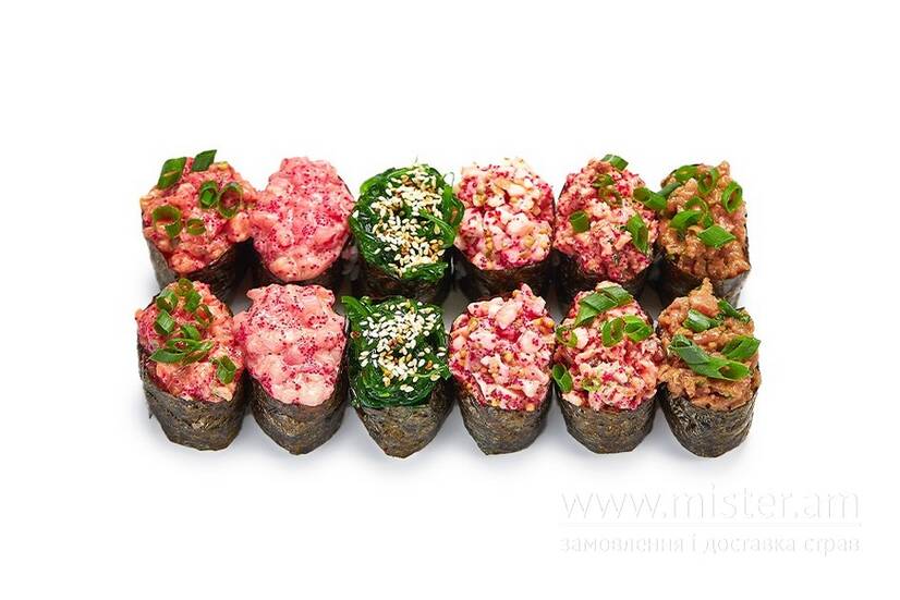 Гункан з лососем 2 шт., гункан з вугрем 2 шт., гункан з креветкою 2 шт., гункан з тунцем 2 шт., гункан з гребінцем 2 шт., гункан з чукою 2 шт.