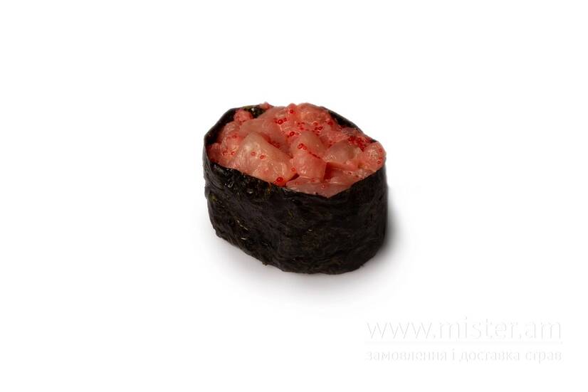 Рис, норі, японський майоез, морський гребінець, соус шрірача, ікра летючої риби.