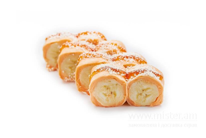 Рисове тісто, банан, сир маскарпоне, крем-сир, білий шоколад, манговий сироп, манговий топінг, сир вершковий.