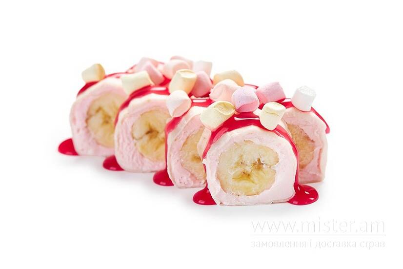 Рисове тісто, банан, сир маскарпоне, крем-сир, сир вершковий, сироп бабл-гам, топінг бабл-гам, зефір.