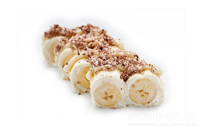 Рисове тісто, банан, сир маскарпоне, крем-сир, сир вершковий, стружка кокосу, топінг білий шоколад, баунті, сироп кокосовий.