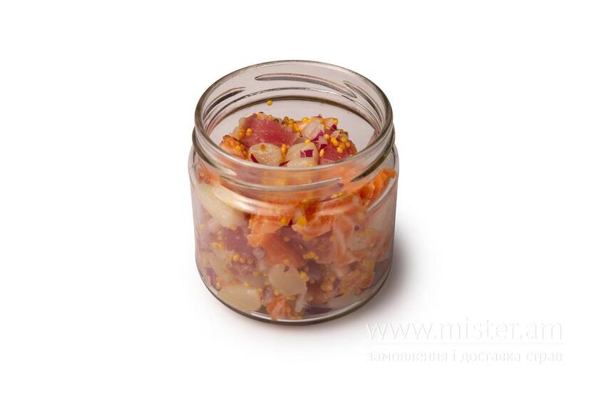 Лосось, морський гребінець, тунець, майонез японський, цибуля марс, гірчиця діжонська, оливкова олія.