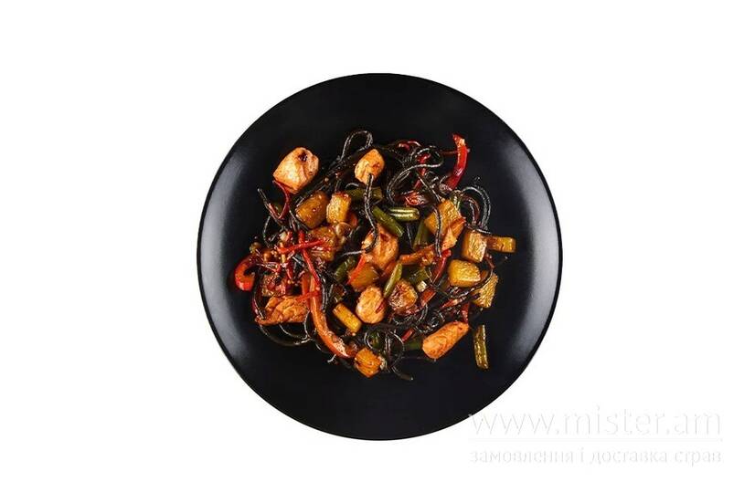 Удон неро, лосось, ананас, перець болгарський, спаржа, цибуля марс, часник, гірчиця, пад тай, теріякі, соус авторський, соус токанцу.