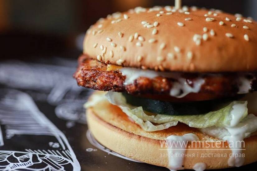 Булка чізбргер з кунжутом, 2 соуса, айберг, огірок, помідор, котлета з курки, сир.