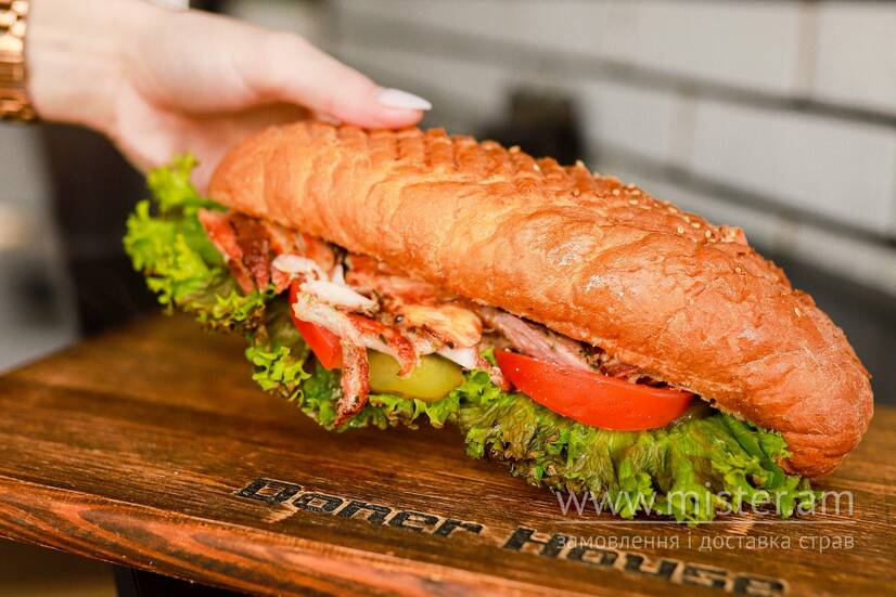 Булочка, соус часниковий, соус овочевий, огірок, помідор, м`ясо курки.