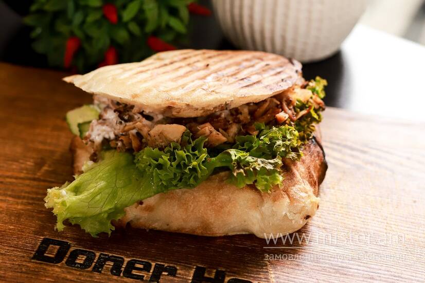 Булочка з тандира, соус овочевий, соус часниовий, лист салата, помідор, огірок, м`ясо курки.