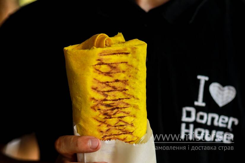 Лаваш, капуста, помідор, перець болгарський, огірок, соус овочевий, соус часниковий, м`ясо курки, картопля фрі.