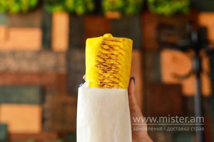 Лаваш, капуста, помідор, перець болгарський, огірок, соус овочевий, соус часниковий, м`ясо телятини, картопля фрі.