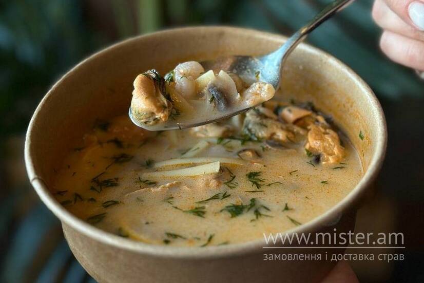 Бульйон, кокосове молоко, паста Том Ям, локшина, лимон, мідія, креветка, гриби.