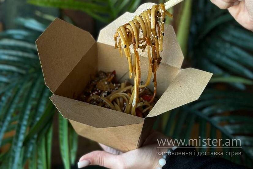 Локшина, кунжут, соєвий соус, мʼясо телятини, морква, перець болгарський, капуста, цибуля.