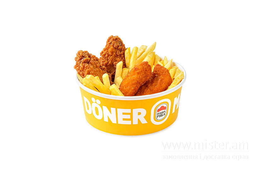 Крильця курячі, стріпси курячі, картопелька фрі.
