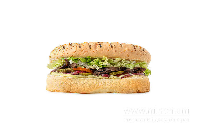 Cоковита яловичина, свіжі овочі, мариновані цибулька та огірочки, з фірмовим авторським соусом в рум`яній булочці.