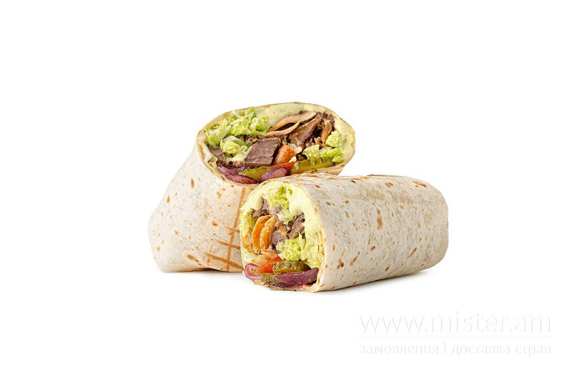Cоковита грильована курочка та яловичина, свіжі овочі, маринована цибулька та огірочки, фірмовий авторський соус у тонкому лаваші.
