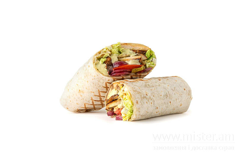 Ніжна грильована курочка, свіжі овочі, маринована цибулька та огірочки, фірмовий авторський соус у тонкому лаваші.