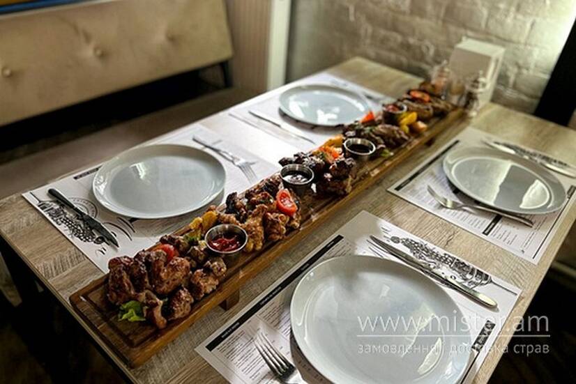 Шашлик, люля-кебаб, ребра свинні, шашлик курячий, курячі крильця, картопля, соуси.